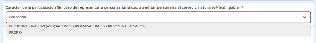 3- Carácter en que participa: En este campo tenés que aclarar si te presentas en representación propia, o a nombre de otra persona (el caso de una persona que no pueda conectarse o tus hijos por ejemplo) o de alguna institución u organización de la sociedad civil. Si te anotas en representación de otra persona jurídica deberás indicar el nombre, el cargo y la personería jurídica.