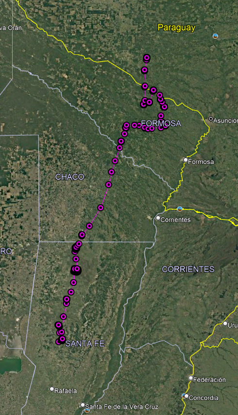 Nombrado como Ekilore (“Girasol” en Euskera, idioma originario del País Vasco) al momento en que los investigadores la equiparan con el emisor satelital en febrero de 2024, permaneció a partir de ese momento en su territorio natal durante más de un año. El pasado 9 de mayo, sin embargo, esta joven hembra de águila coronada inició súbitamente un recorrido de más de 700 km desde la zona cercana a la localidad de San Cristóbal (Santa Fe), viajando a través de las provincias de Chaco y Formosa hasta cruzar el río Pilcomayo e ingresar al vecino país de Paraguay el 3 de junio, completando todo el trayecto en menos de un mes.